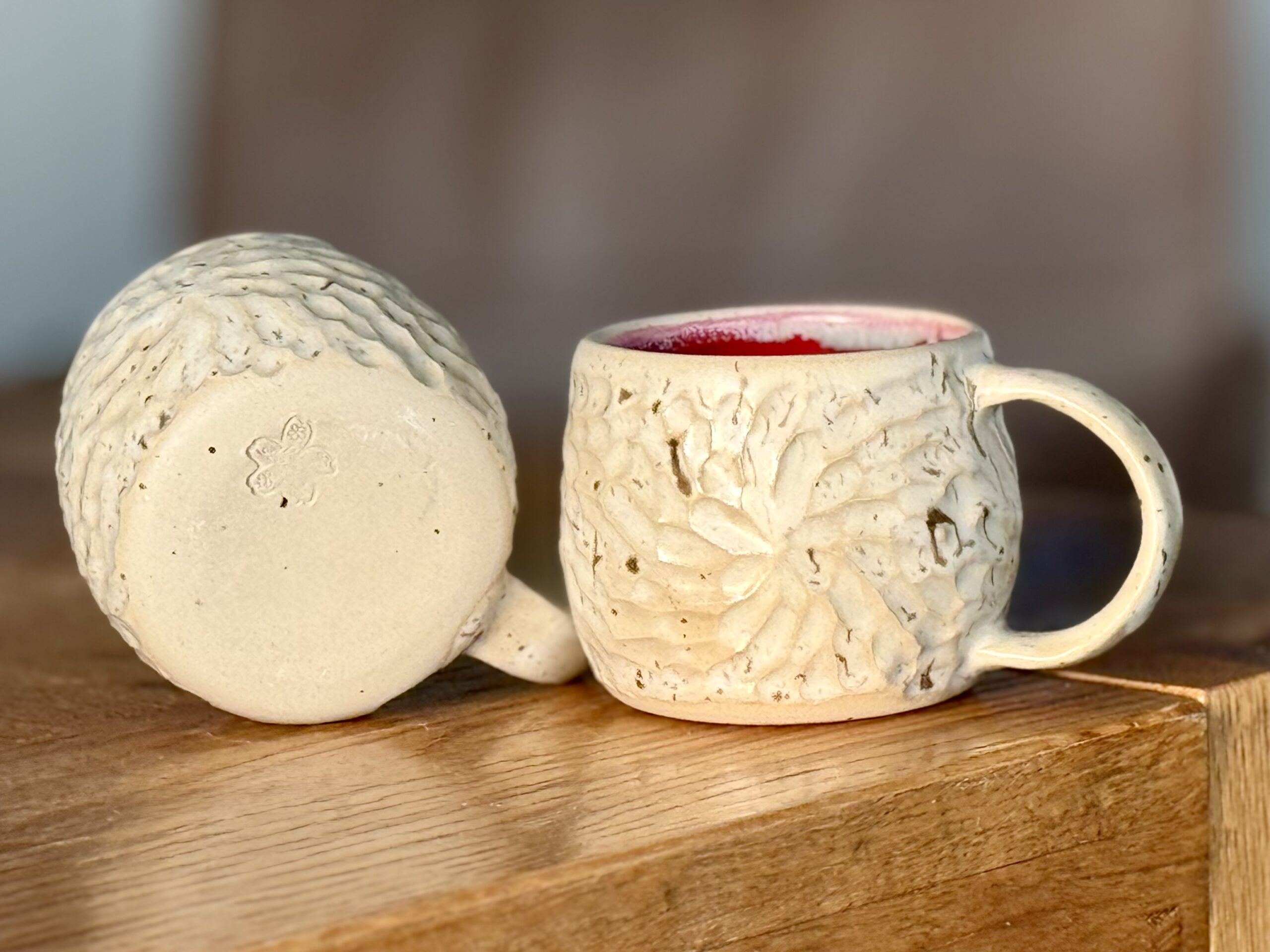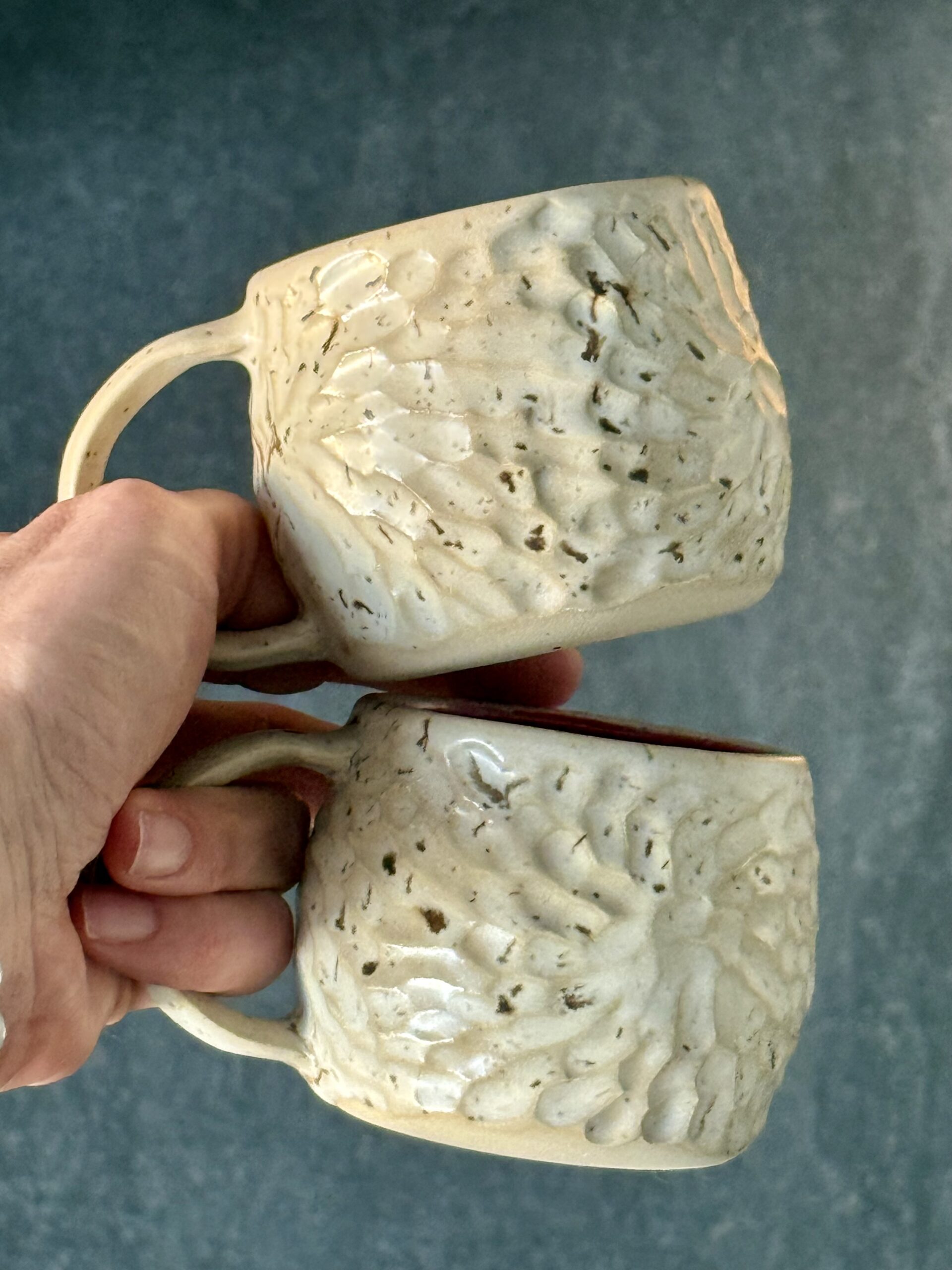 Ces mugs ont été conçus et réalisés entièrement à la main en argile de grès durable et finis avec un émaillage de qualité alimentaire et ils passent sans problème au lave-vaisselle. Il ont été conçus pour un usage quotidien.